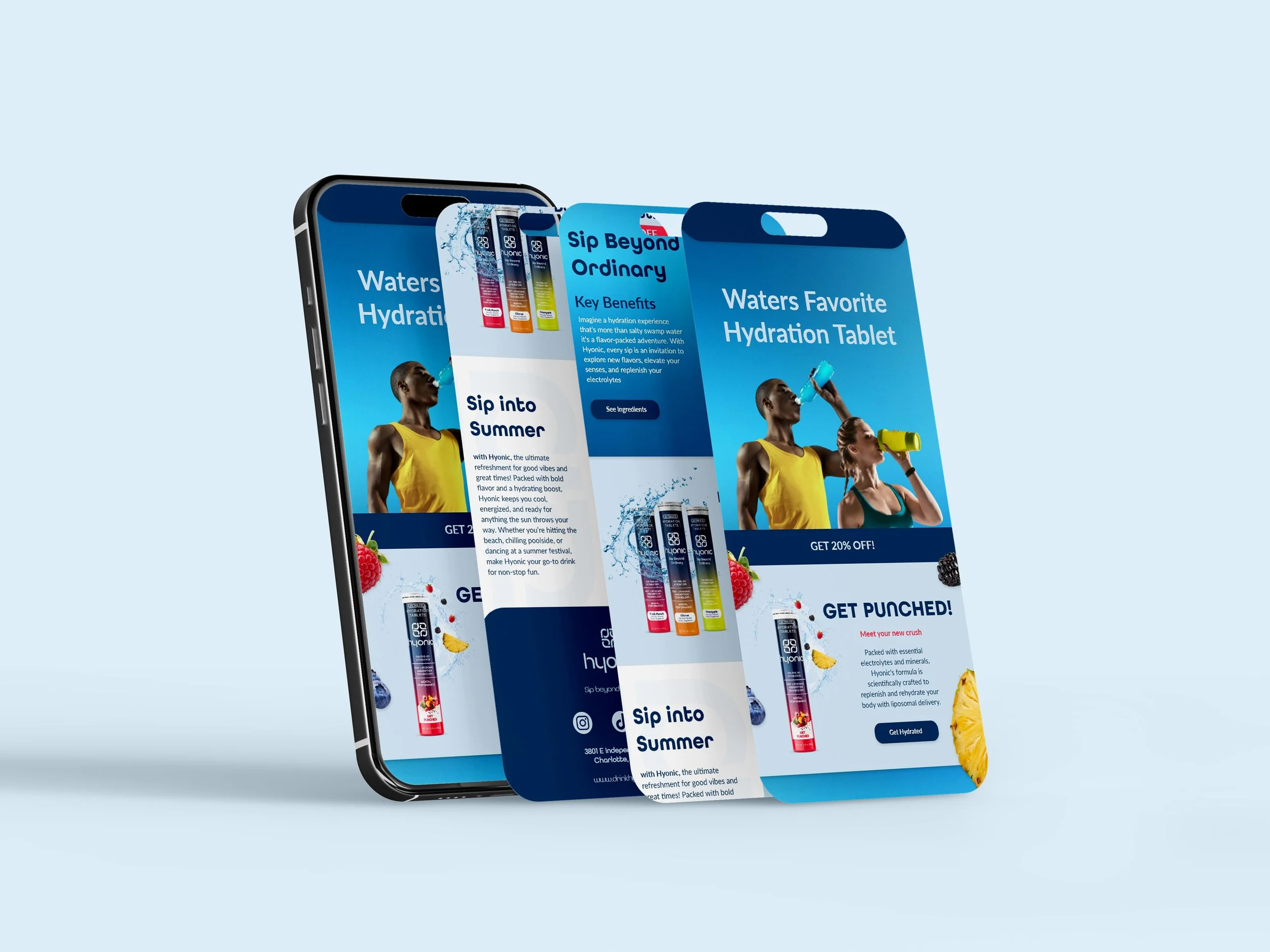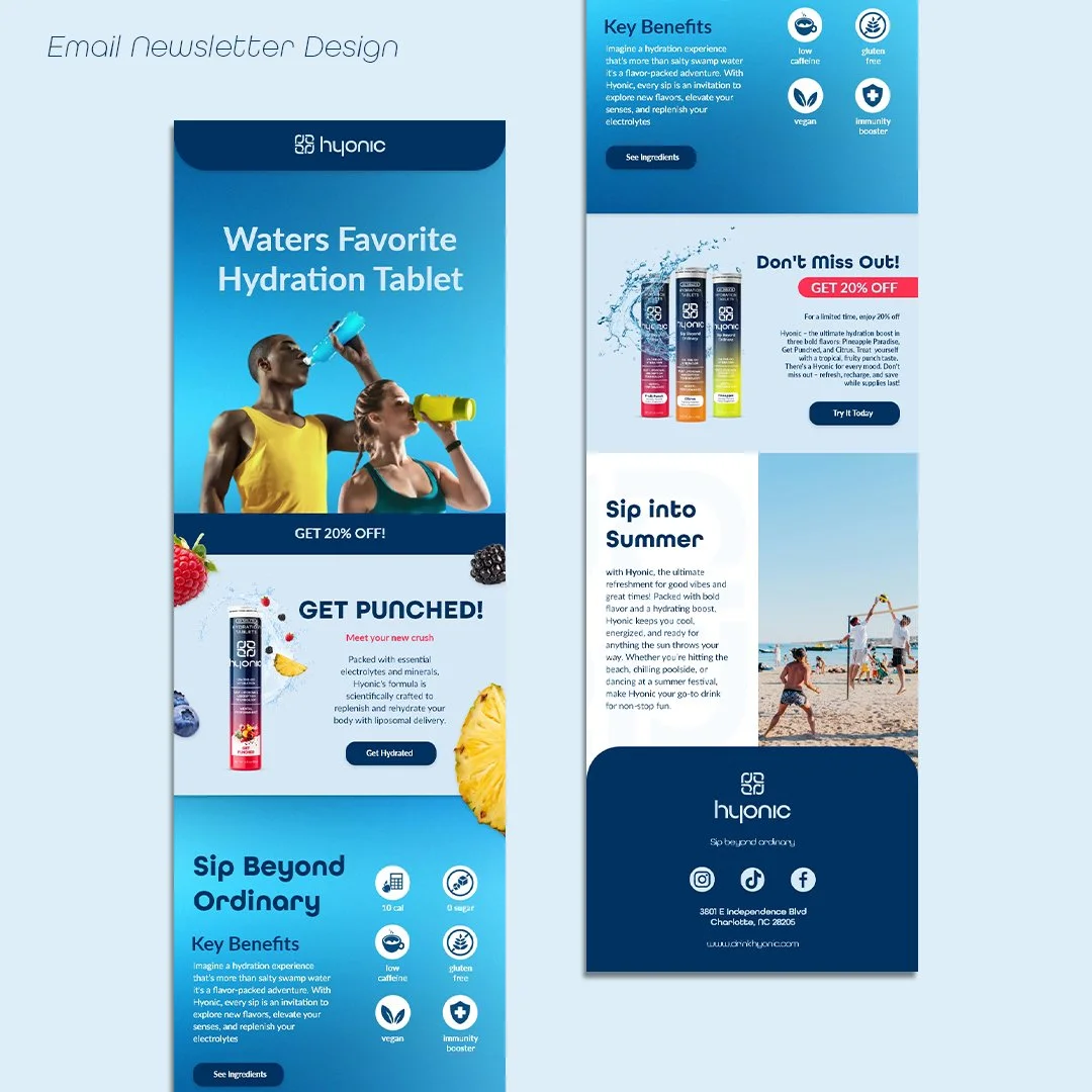 in a Design Challenge for Pinckney Harmon I designed a social media campaign for Hyonic Drink, I created a cohesive social media campaign including An email newsletter and engaging graphics and content that highlighted the product’s benefits, emphasizing audience engagement and brand identity. This project demonstrates my ability to craft visually appealing marketing materials for both social media and email communications in a professional agency context.